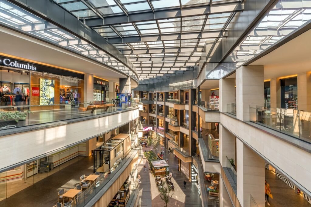 Arquitectura moderna, tiendas, restaurantes y cine.